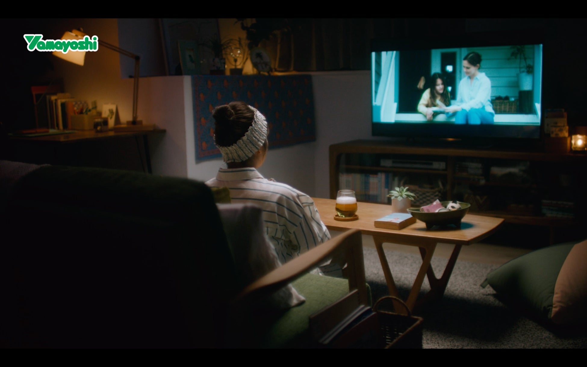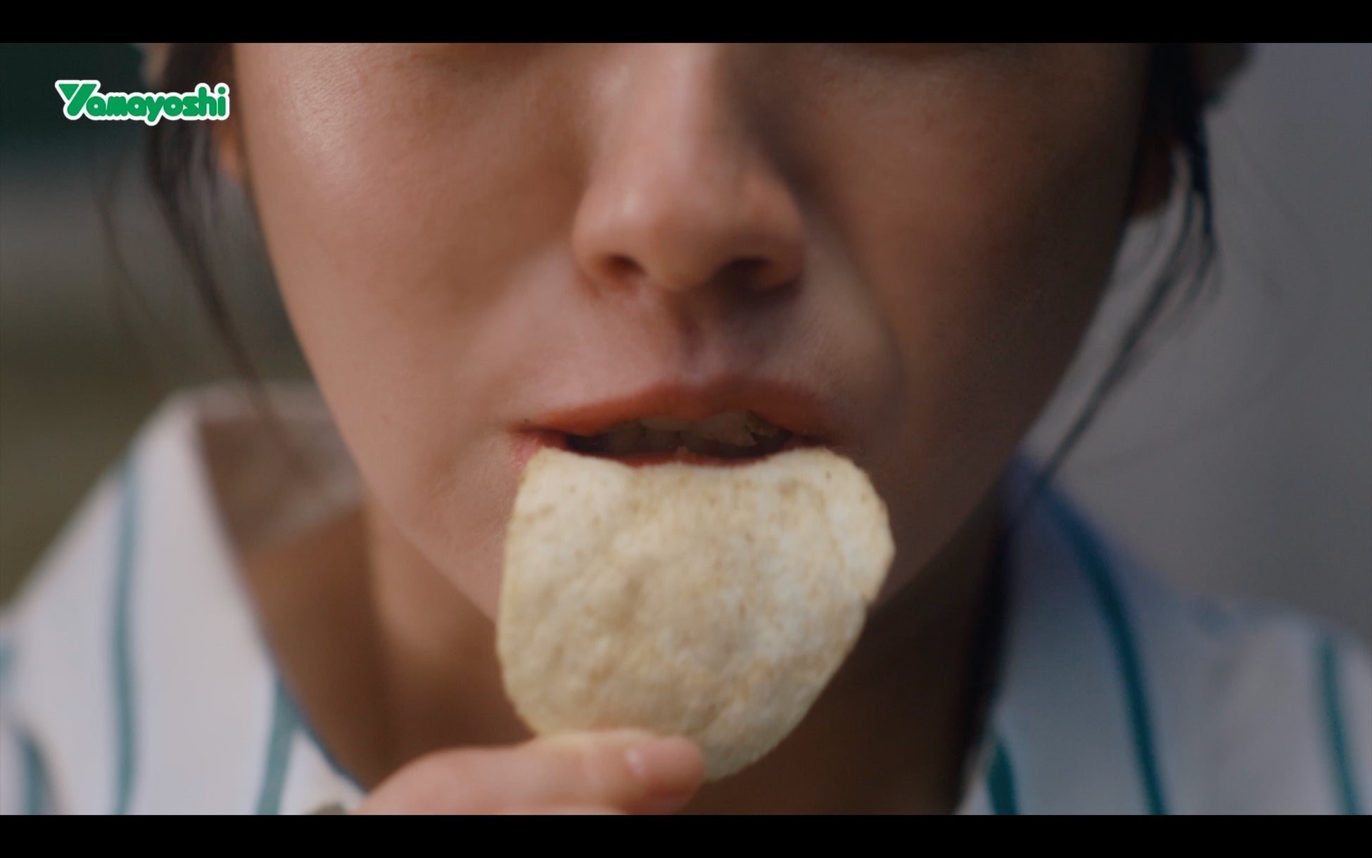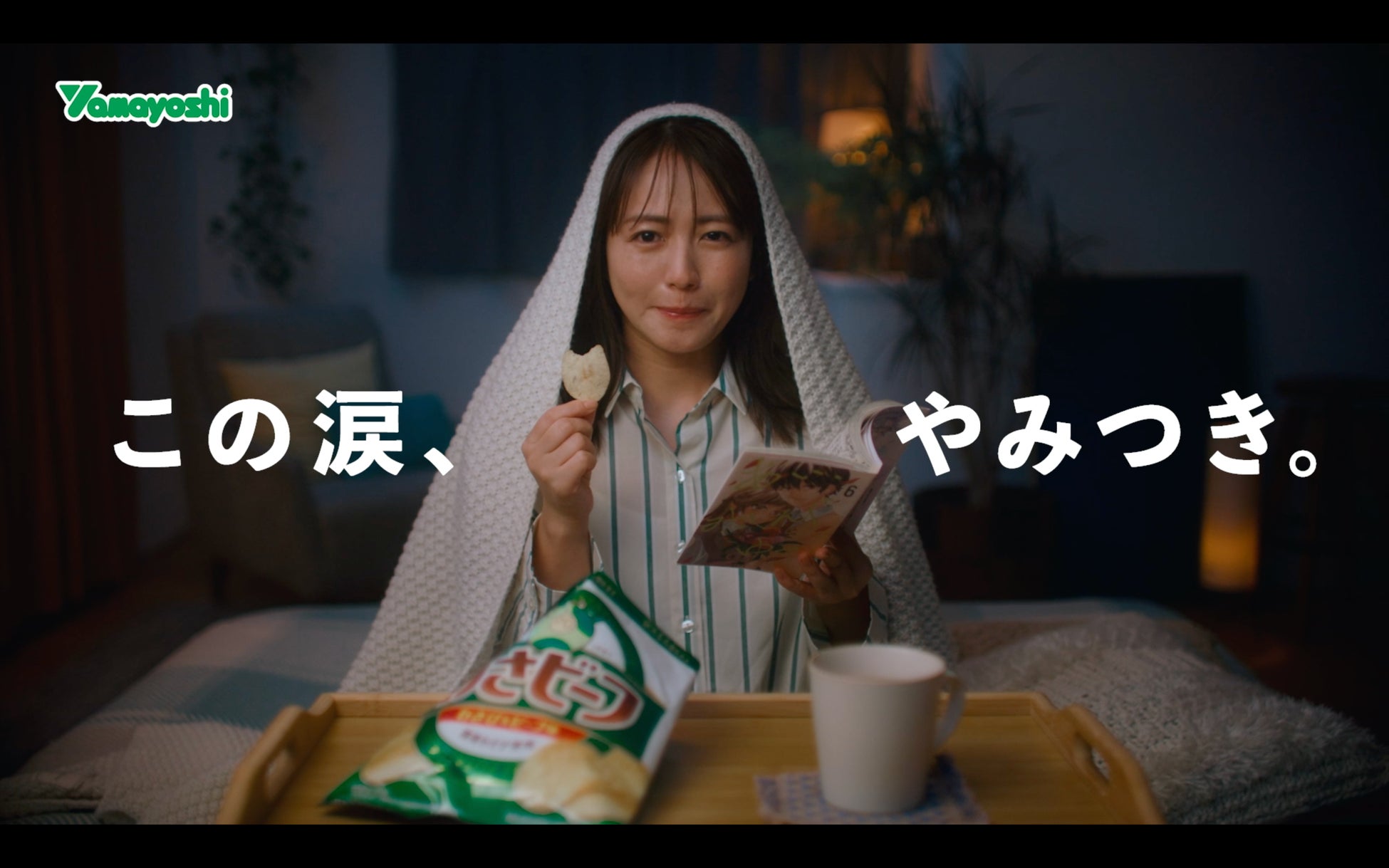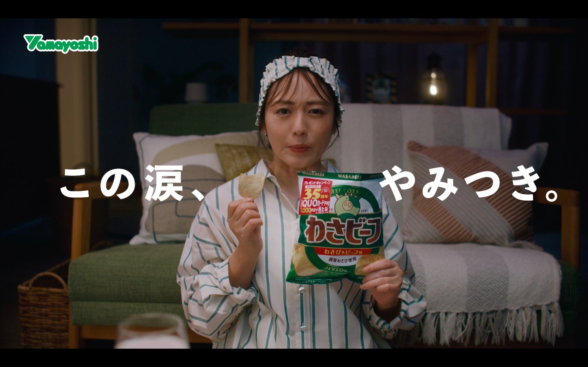 お風呂上がりに、わさビーフをおともにお家で恋愛映画やマンガを見て感動で涙を流す磯山さん。よくあるワンシーンかと思いきや…実はわさビーフのツンピリで涙を流していたのです。わさビーフのツンピリにやみつきになり、わさビーフ食べる手が止まらず次から次へと口に運び涙を流す磯山さん。食べ終わると「食べすぎた〜」「最高〜!」と満足げな様子で充実した夜を過ごします。CM内で「ツンピリで、美味しい」と呟くように、病みつきになってしまうわさビーフのツンピリを涙で表現する磯山さんの表情に注目です。