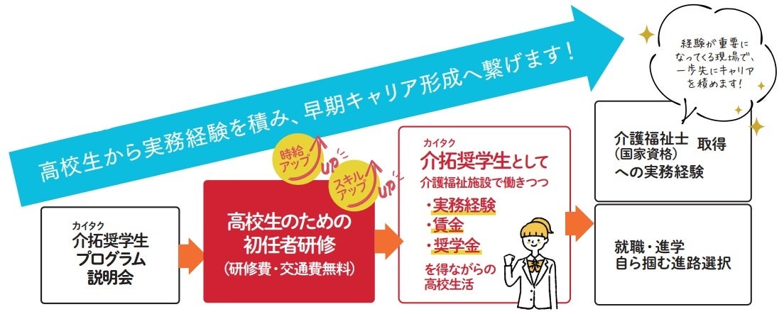 つきましては、この仕組みをより多くの高校生、保護者、関心ある教育関係者や介護福祉関係者に情報を届けたく、高校生介拓アワードおよび高校生達が実際に働きながら学ぶ様子についてご取材いただけますよう、何卒よろしくお願いいたします。