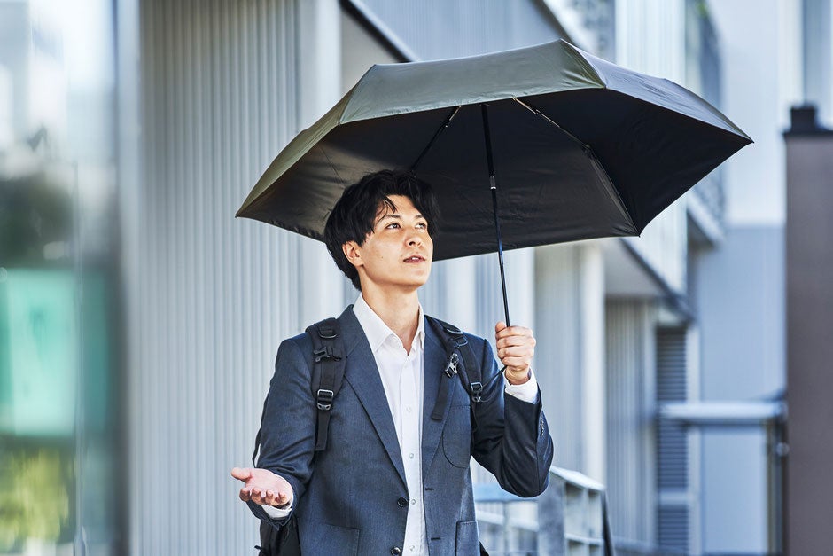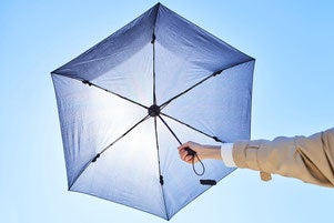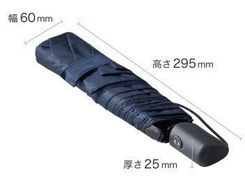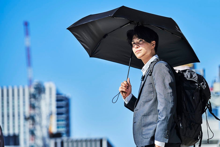 遮光率100%、UVカット100%(UPF50+)、可視光線カット100%、近赤外線カット99.9%の生地を採用。風速15m/sに耐えるカーボンファイバーフレームの晴雨兼用傘折りたたみ傘。