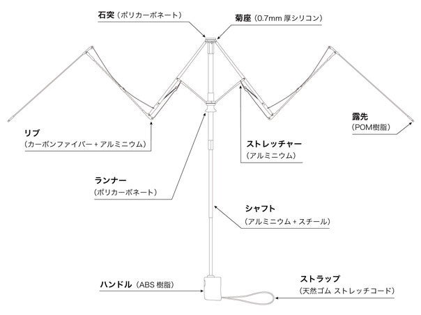 フレームの親骨部分にはカーボンファイバーを使用。