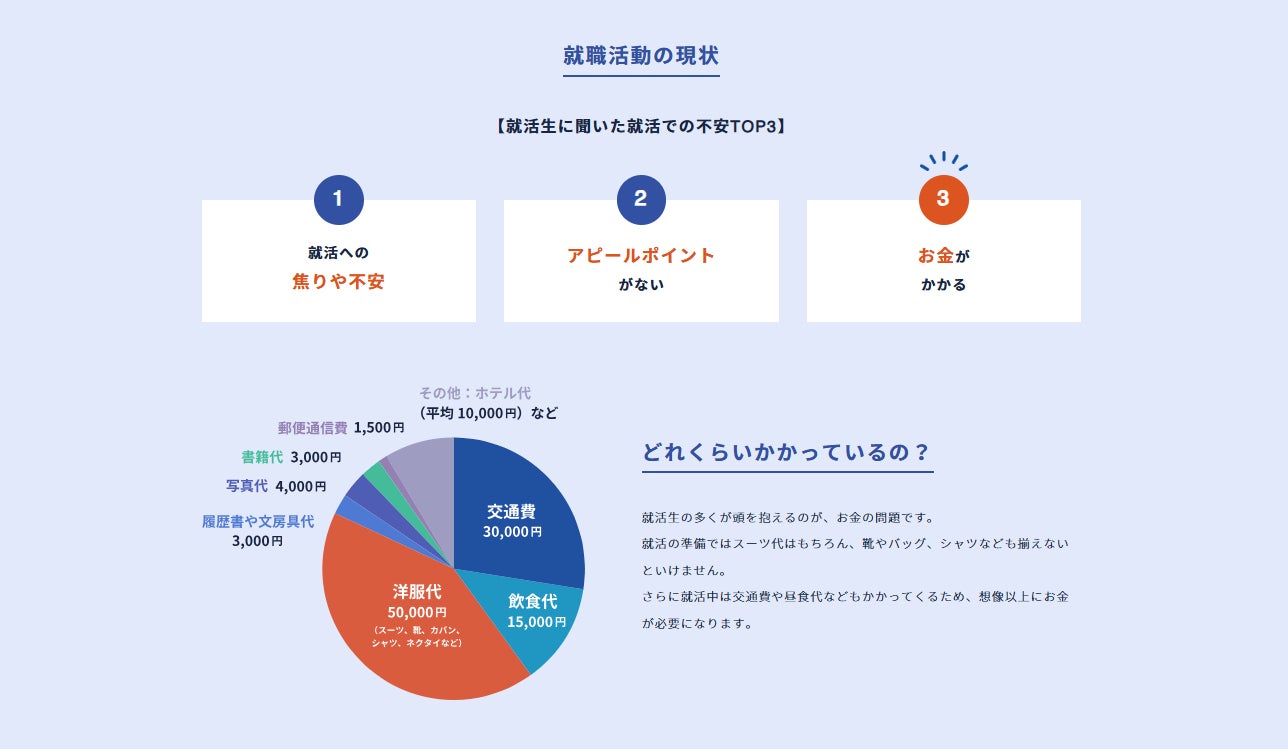 就職活動において、学生が抱える不安の一つに「お金がかかる」という課題があります。 就活生に聞いた不安TOP3の中でも、金銭的な負担は常に上位に挙げられており、リクルートスーツの購入費をはじめ、企業説明会や選考に伴う交通費、面接前後の飲食代など、就活準備の段階から多くの費用が発生しています。