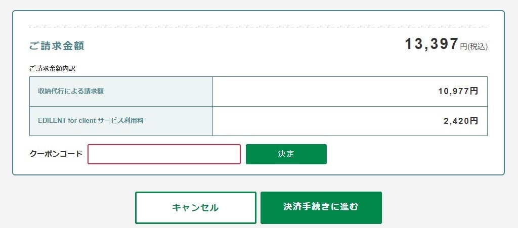 4.決済画面にて、クーポンコードを入力する欄に、配布中のクーポンコードを入力してください。