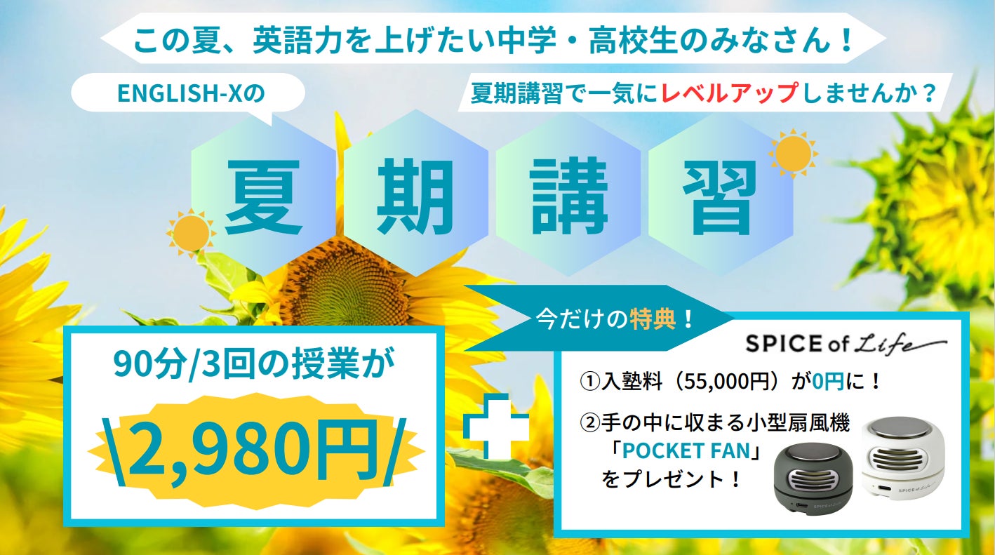 株式会社スリースパイス(本社:東京都目黒区 代表取締役:渡辺一正)が展開する、東京都目黒区を拠点とする難関大学・高校受験対策塾ENGLISH-Xでは、中学生・高校生・高卒生に向けてこの度「夏期講習」を開講いたしました。