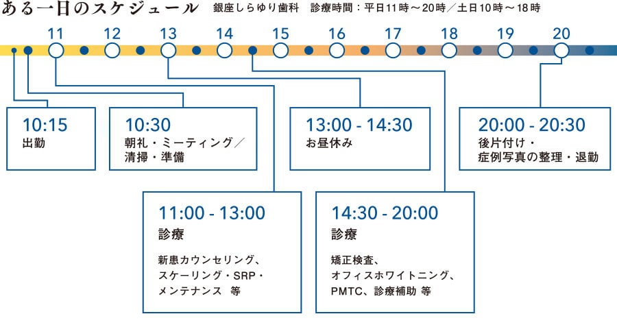 1年目は診療アシスト、カウンセリング業務、スケーリング・ルートプレーニングを中心に行い、徐々に資料採得(口腔内写真撮影、光学印象、プロービングなど)や自費診療(歯周病治療・ホワイトニング・PMTCなど)を担当していただきます。