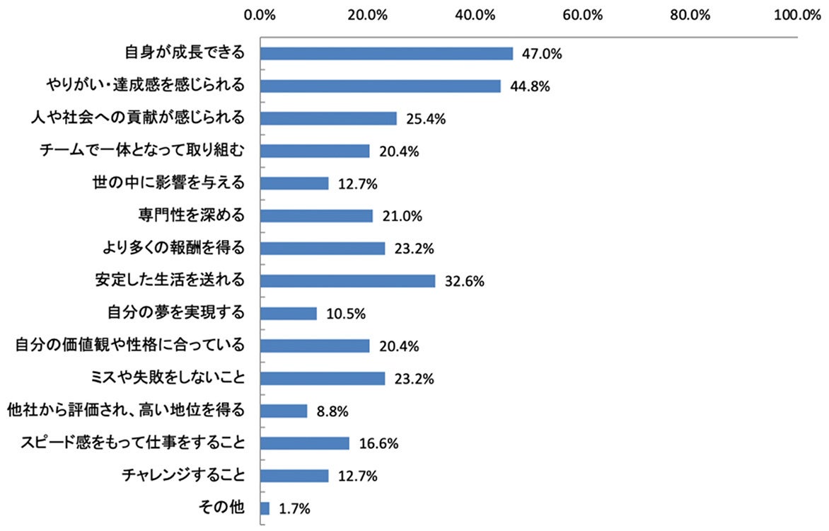 - 一方で、「安定した生活を送れる」が3位に入ったほか、「他者から評価され、高い地位を得る」「自分の夢を実現する」「世の中に影響を与える」「チャレンジをする」という回答は少なく、「着実に仕事をこなしたい」姿勢も垣間見えました。