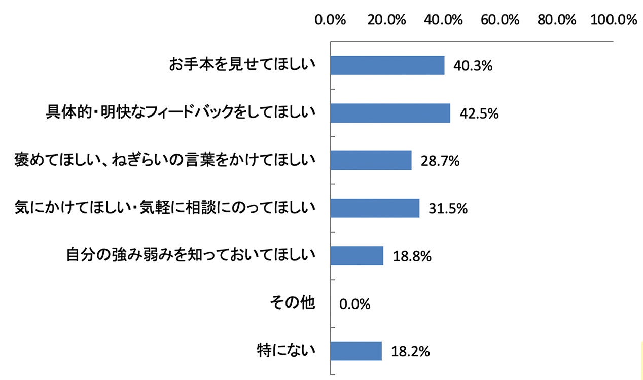 - 先輩・上司に求められるのは「お手本」。約4割が「お手本を見せてほしい」と回答