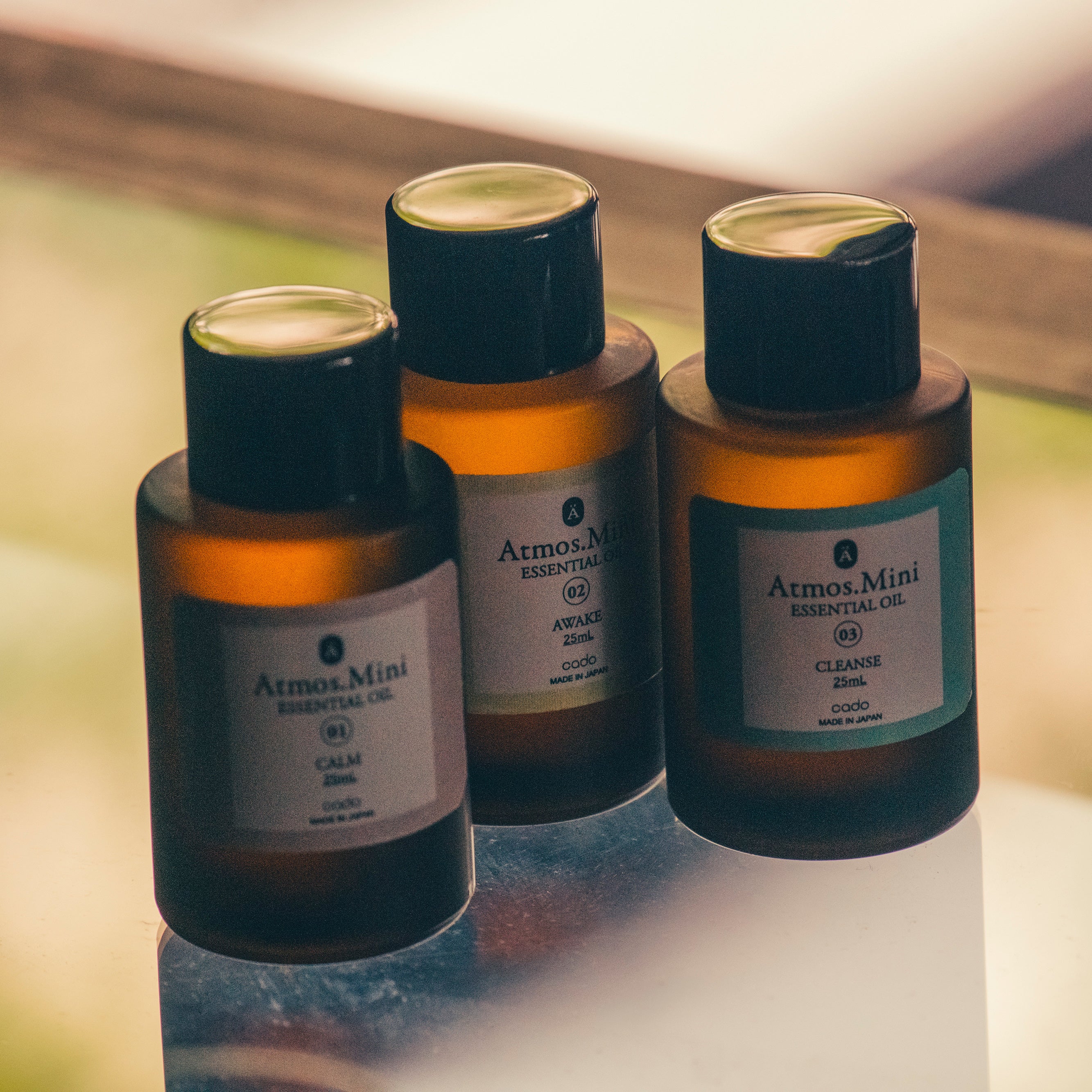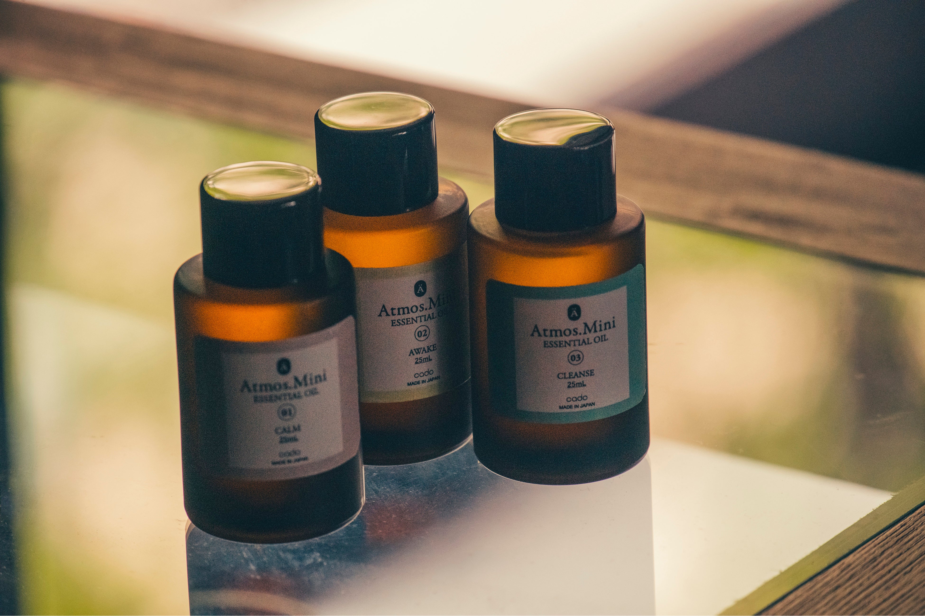 STEM Mini に使用するオリジナルアロマリキッド Atmos. Mini。CALM(リラックス・眠り)・AWAKE(リフレッシュ・集中)・CLEANSE(除菌・消臭)、3つの機能性と香りのバランスにこだわったリキッドは、いずれも 6 種以上の 100%天然精油をブレンドしたものであり、その豊かな香りとマイクロミストで効果的に噴霧・拡散することで、アロマ空間をお楽しみ頂けます。