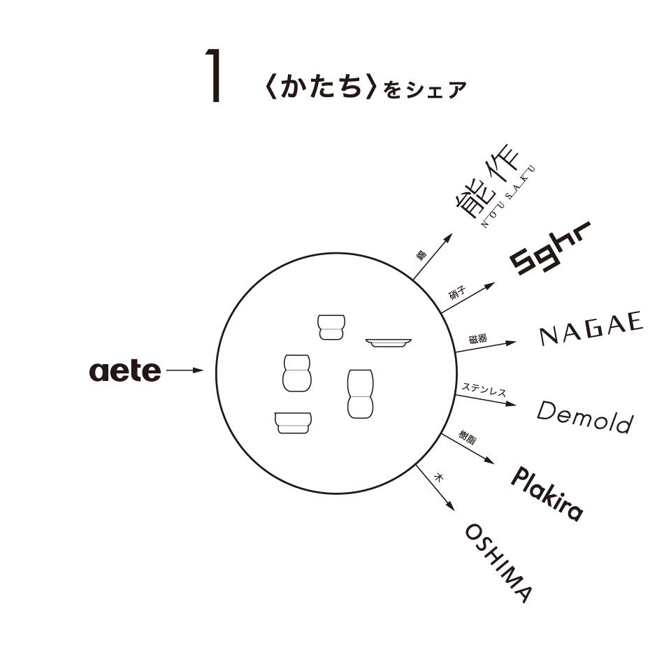 2つの円という共通の“かたち”をもとに、日本全国のメーカー職人と共に、器の形はもちろん、ブランドそのものをシェアすることで、既存のブランドの枠を超えた、新たなものづくりの「プラットフォーム」として愉しさや美しさを提案するテーブルウエアブランドです。
