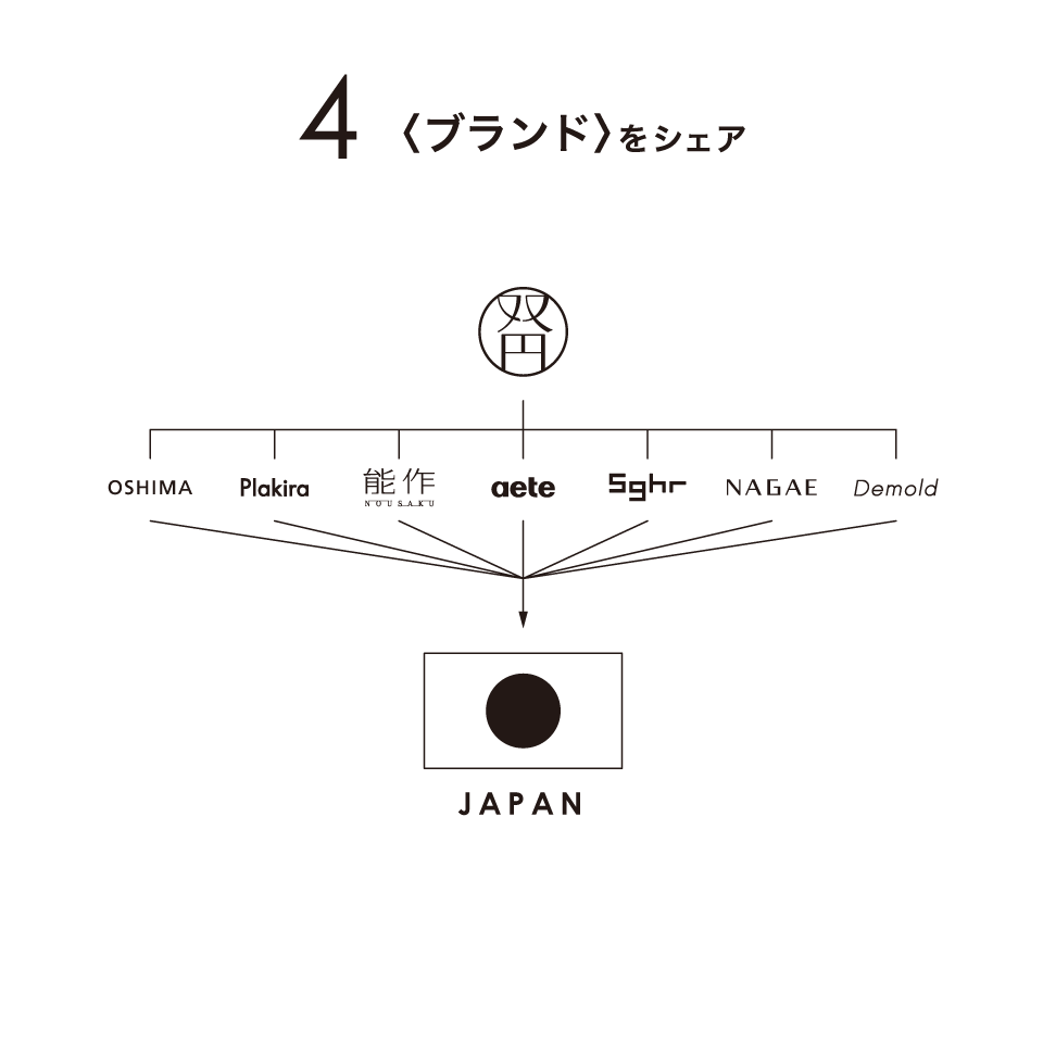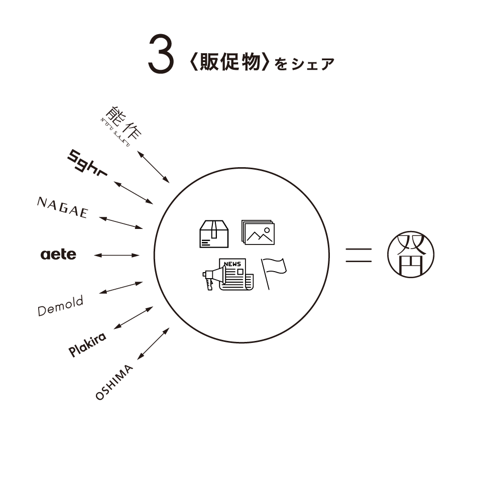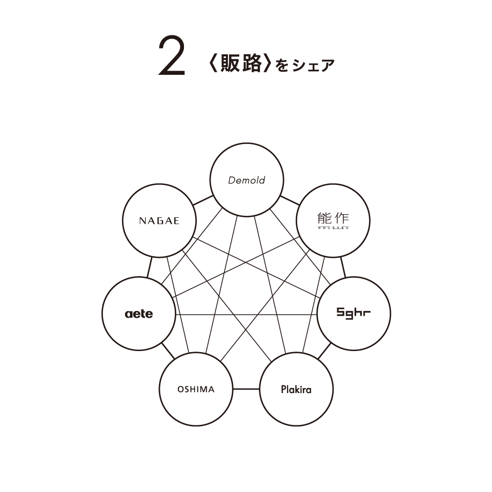 メーカー間を横断するブランド運営により、各メーカーのデザイン費用の削減、梱包資材の共有、広告費用の削減に加え販路の共有など、効率よく商品の開発からお客様の手に届くまでの全体の「ものづくりの仕組み」をデザインしています。