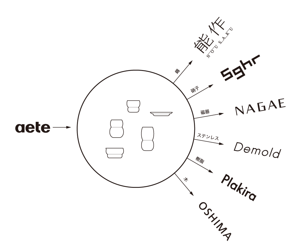 デザインを異なる日本の伝統産業(メーカー)で共有することで、同じかたちをもったさまざまな素材のプロダクトを展開します。