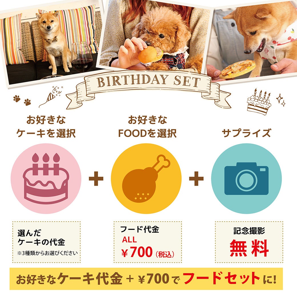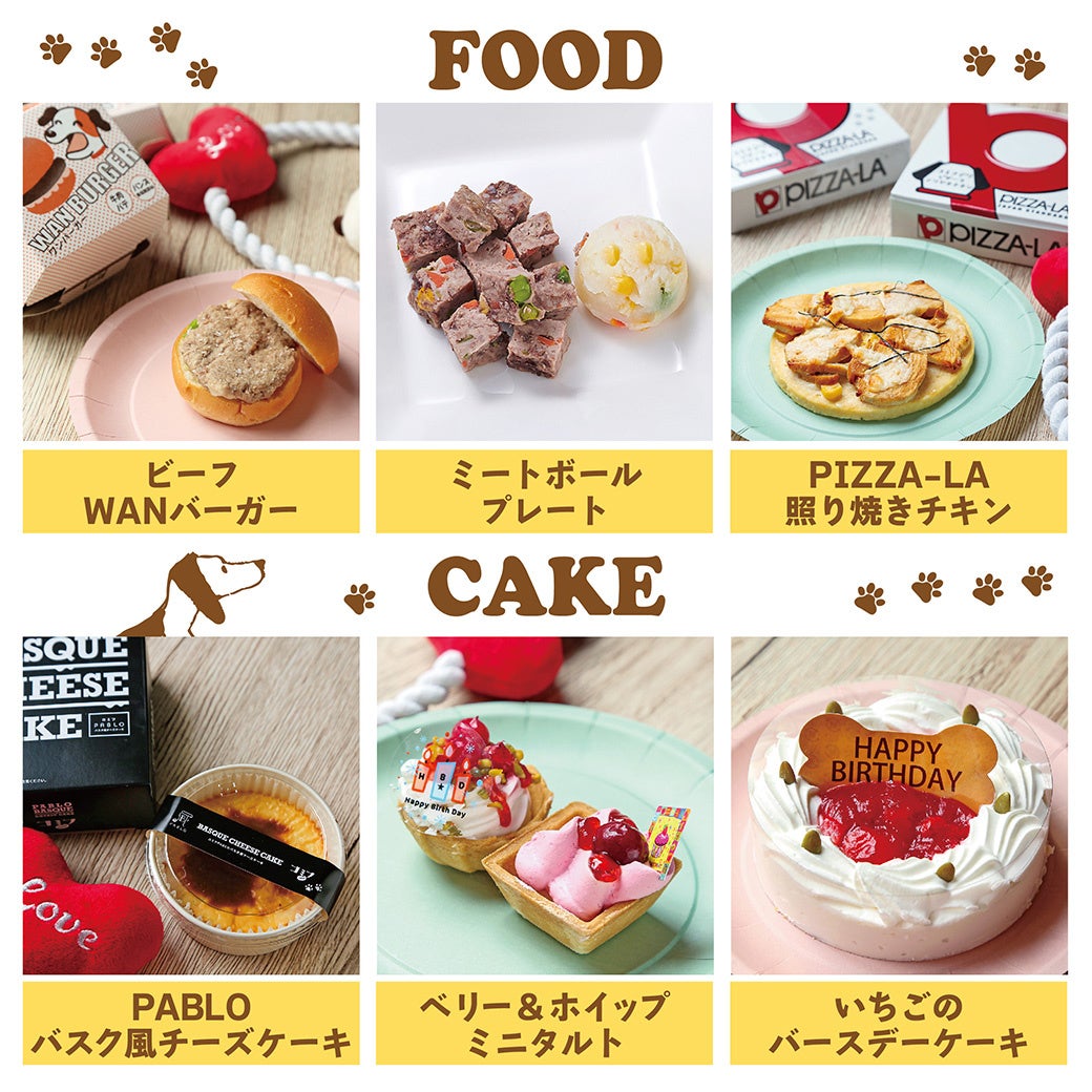 わんちゃんが安心して食べられる、本格的なハンバーガーやピザ。そして愛犬の誕生日祝いができるホールケーキも用意いたしました。
