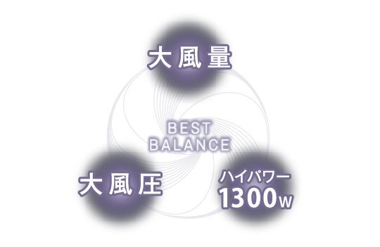 大風量×大風圧×ハイパワーのベストバランスを追及することで、”速乾”を実現しています。
