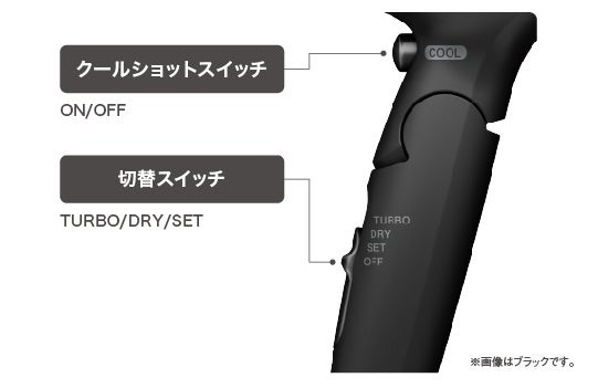 操作しやすい3段階の切替スイッチは、「TURBO」、「DRY」、「SET」からお好みの風を設定できます。また、クールショットスイッチを搭載し、冷風/温風をワンタッチで切り替えられます。