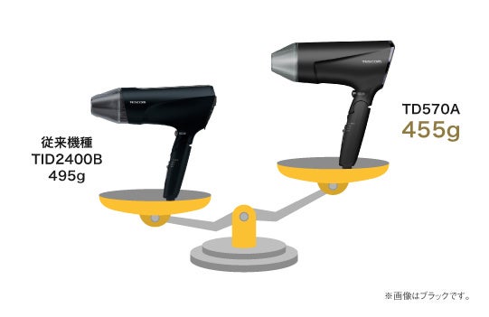 今春新たに発売するTD570Aは、速乾性はそのままにさらなる軽量・コンパクト化を実現し、ロングヘアや毛量の多い方でも腕が疲れにくくより快適なドライ時間を提供します。
