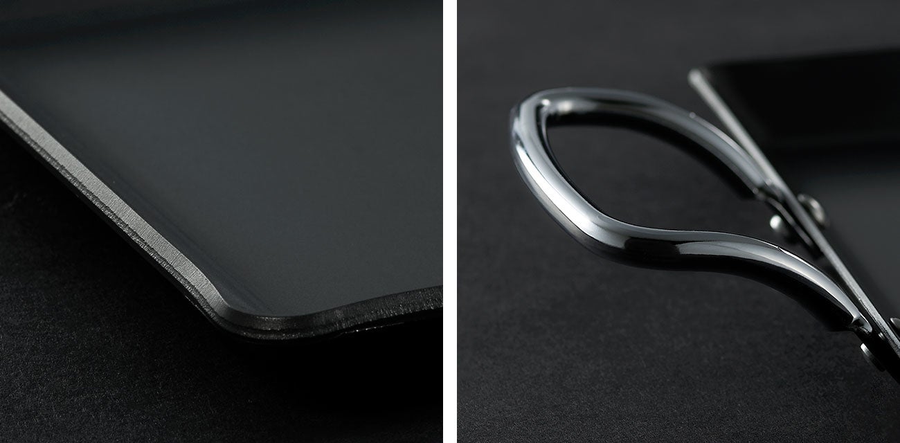 厚みのある鉄板を1点ずつプレスで成形。溶接でフチを接合されている製品とは違って接合面が無く、表面からエッジに至るまで滑らかで美しい仕上がりになっています。