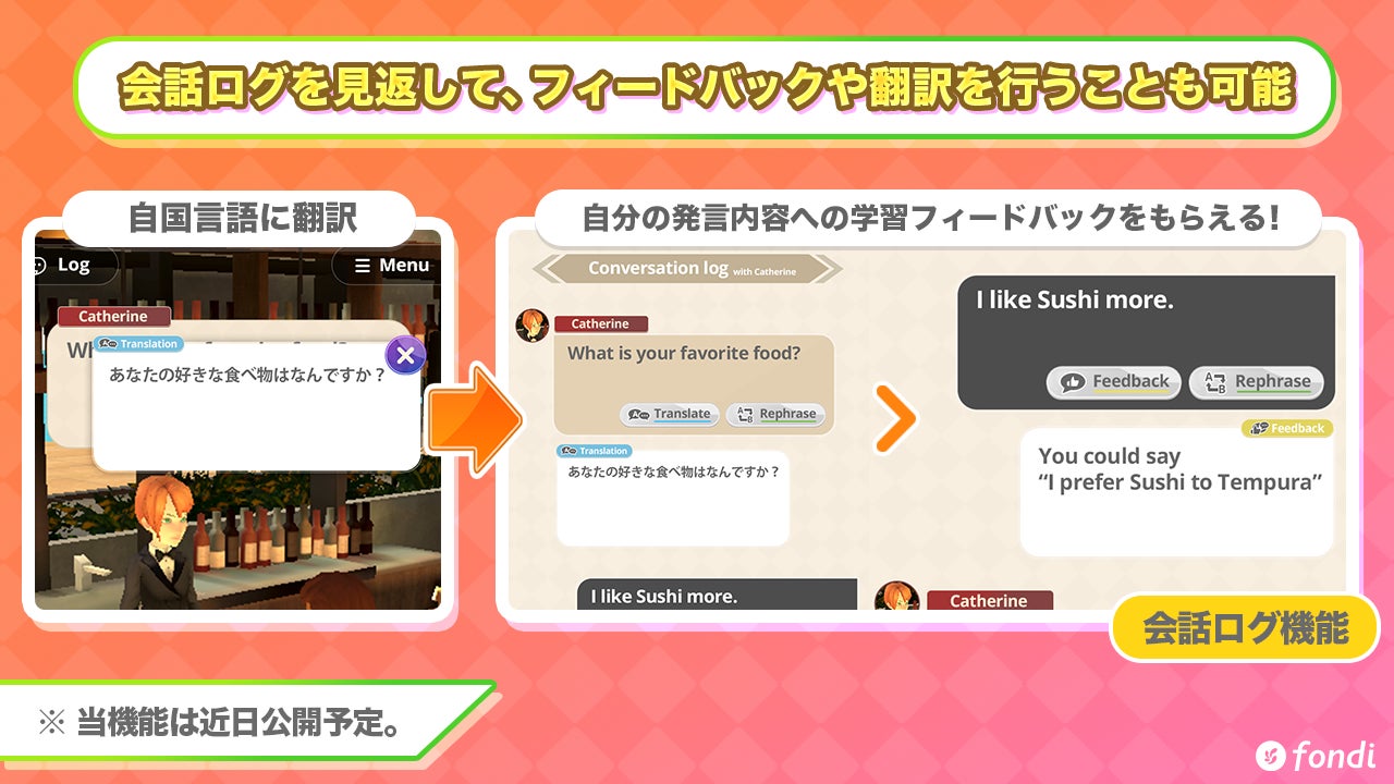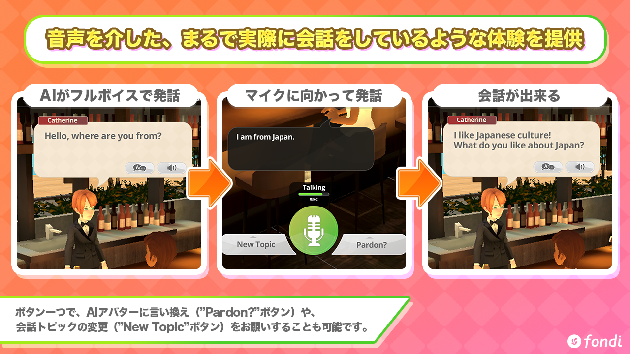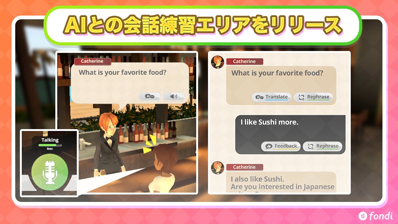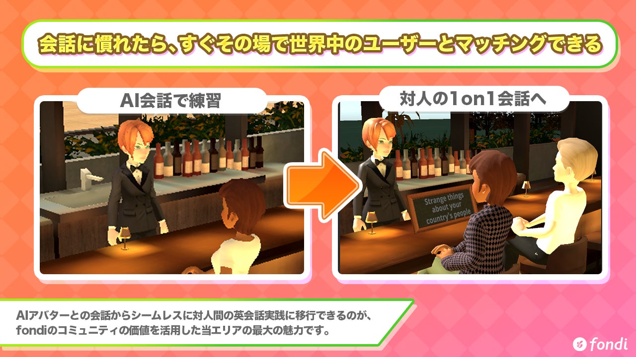 当該エリアでは、fondiの案内人である「キャサリン」(AIアバター)が会話の主導役となり、実践的でカジュアルな「英語を使っての会話経験」を楽しむことができます。