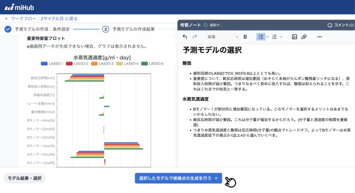 データの登録から解析設定、実験点の選択、結果の考察に至るまで、MIを用いた実験計画における各ステップを、直感的にワークフロー形式で管理できるようになっています。また、実験やデータ、解析に関する考察をフローごとにノート形式で蓄積し、それに対してコメントや議論を行うことが出来ます。miHubを通じてノウハウの共有を促進し、ナレッジを蓄積していくことで、チーム全体の研究開発力を向上させることが可能です。