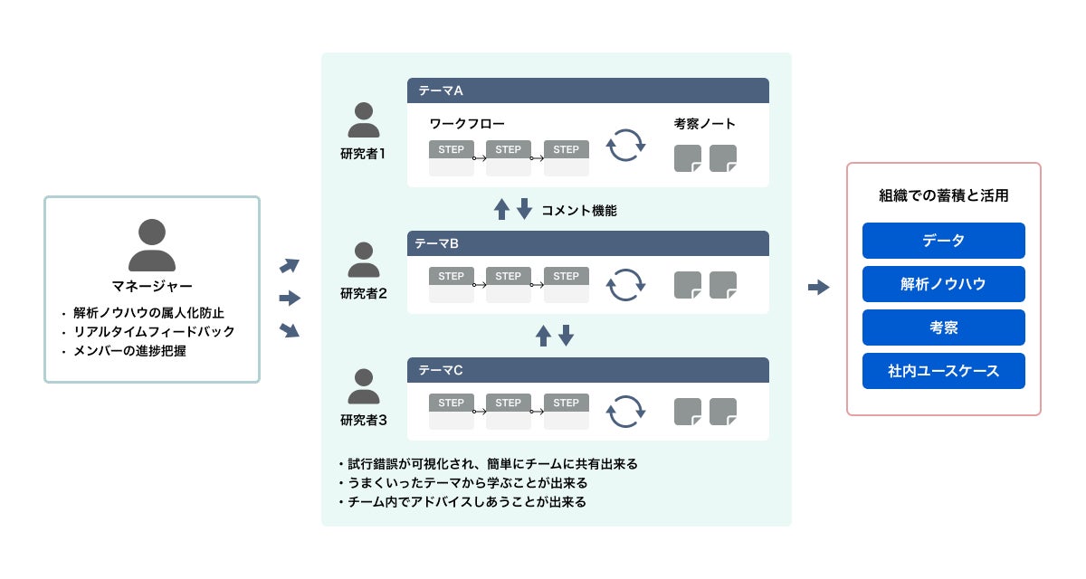 (ノウハウの継承とアクセスの向上)プロジェクトの検討経緯や解析手法もフローごとに明確に記録されるため、第三者による確認や振返りが容易になります。テーマ固有のノウハウに加え、MI活用方法も全員がアクセス可能な形で社内ナレッジとして継承されます。