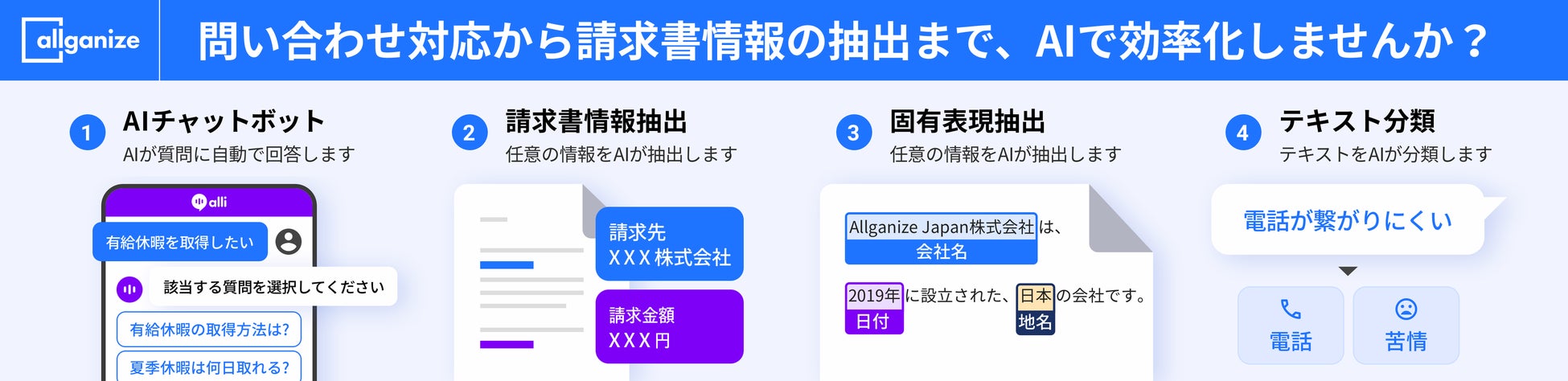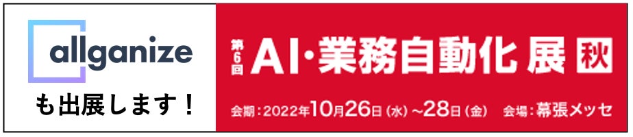 Allganize Japan株式会社は、2022年10月26日(水)~ 10月28日(金)に幕張メッセで開催される 「AI・業務自動化展【秋】」に出展いたします。展示ブースでは、既に日米韓で多くの企業様に採用いただいている AIチャットボット「Alli(アリィ)」をはじめとして、各種業務の最適化・コスト削減を実現する先端の自然言語理解AIソリューション「請求書情報抽出」「固有表現抽出」「テキスト分類」等を展示いたします。