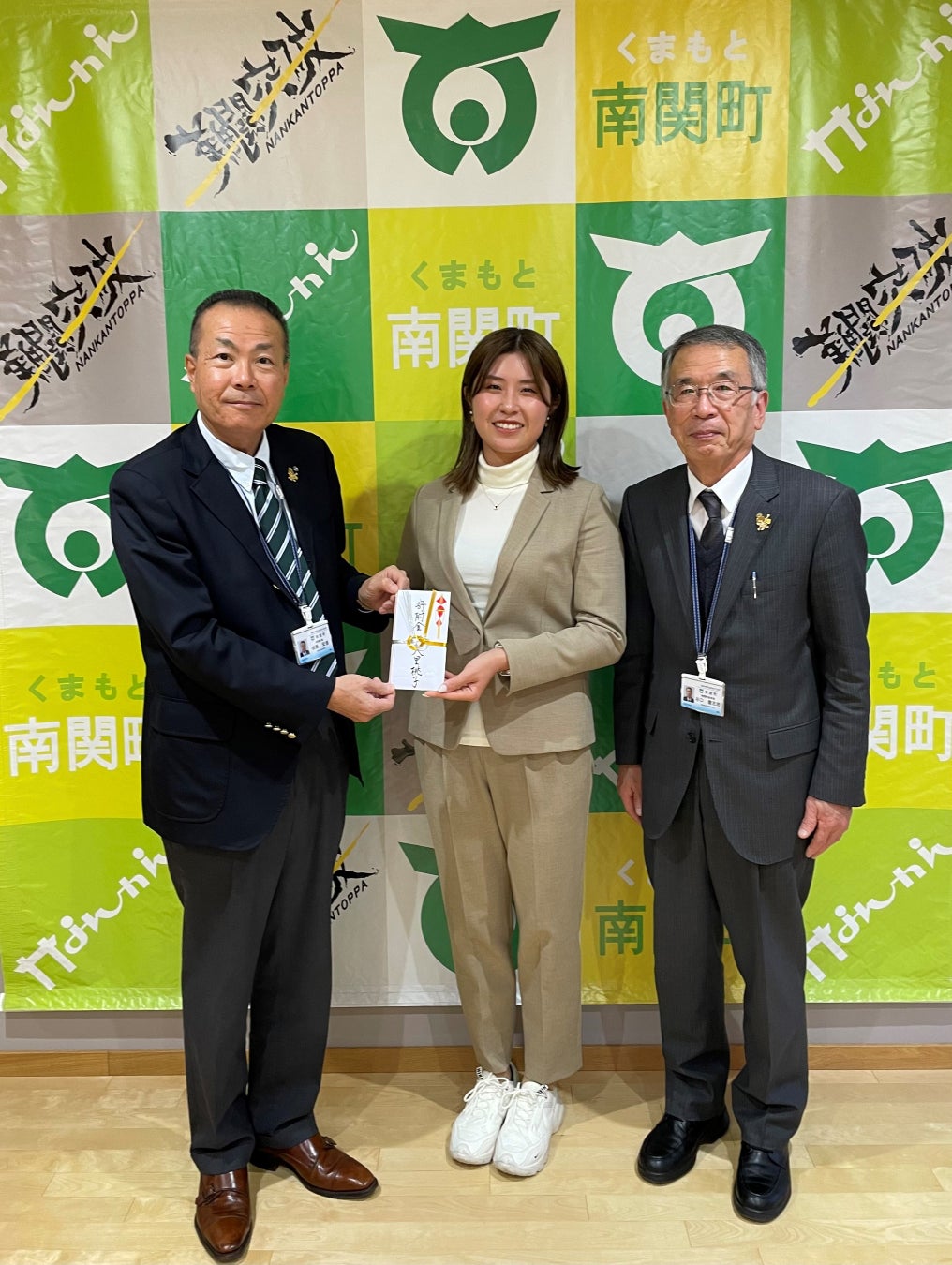 これまで社会貢献ができるプロでありたいという想いから毎年寄付をしてきましたが、2021年より始めたツアー中のバーディー数×@1000円を寄付するという企画を昨年度も実施をし、2023年度のバーディー数232個×1,000円=232,000円を小・中学校の教育活動に役立てていただきたく、2023年12月20日に南関町役場を訪問し、南関町 佐藤安彦 町長に寄付させていただきました。