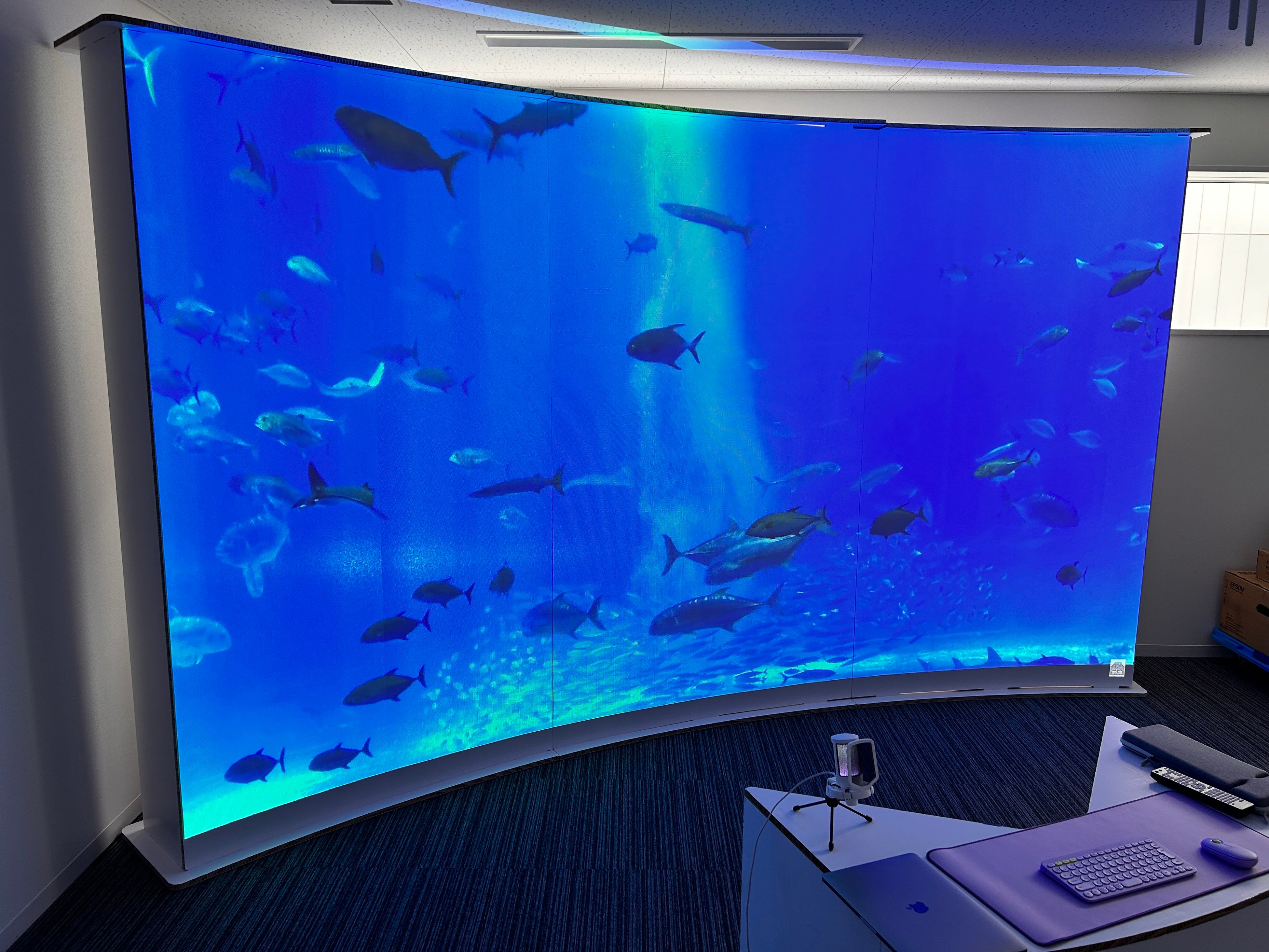 等身大交流システム “CGATE-RA-1007B” は高さ約2m、幅約3mのRe-board®製大型スクリーンと付属のコンポーネントボックスで構成されます。コンポーネントボックスからレーザープロジェクションによってスクリーン部に最大4K解像度の映像を投影、スクリーン上の人々とまるで同じ空間に居るかのような等身大の交流体験を提供します。