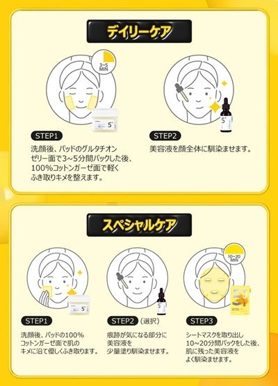 皮膚低刺激性テスト済み*5で優しく肌トーン集中ケアができるナンバーズイン『5番白玉グルタチオンC*1美容液』と『5番白玉グルタチオンC*1フィルムパッド』とのライン使いで相乗効果を発揮!
