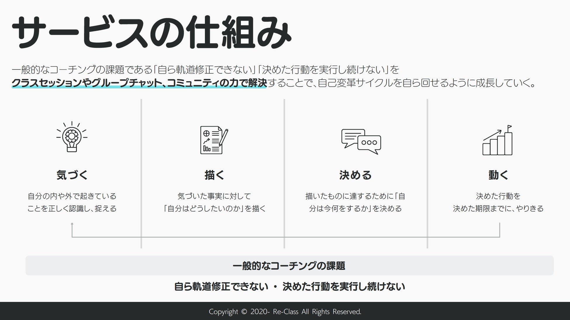 自己目標サポートを行うオンラインコミュニティ「リクラス[Re-Class]」を運営する株式会社D-Activation(代表取締役社長:玉川大樹)は、コーチングを通じた自己変革に際して立ちはだかる課題をコミュニティの力で解決するコーチングサービス「リクラスコーチング」を7月21日(木)にリリースしました。本サービスのリリースに伴い、先着20名様限定で初月の月会費が半額になるキャペーンを実施します。