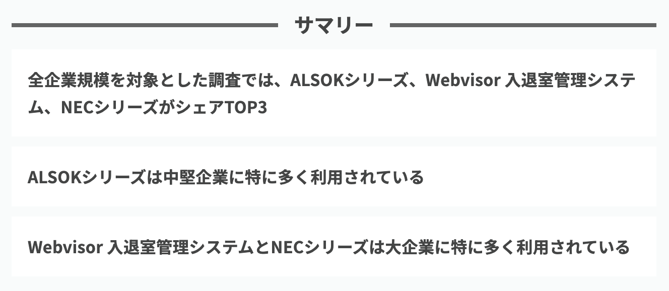受付・入退室管理システム全体では、利用企業の7割以上が大企業および中堅企業で占めているという結果となりました。その中で、特に前述の上位3製品の企業規模ごとの利用割合を比較すると、ALSOKシリーズは中堅企業において全体割合以上、Webvisor 入退室管理システムおよびNECシリーズは大企業〜中堅企業で全体割合以上という結果となりました。このことから、これらの製品はある程度の規模感までは幅広く対応できつつも、ALSOKシリーズはより中堅規模、Webvisor 入退室管理システムおよびNECシリーズはより大規模向きの製品ということが示唆されました。