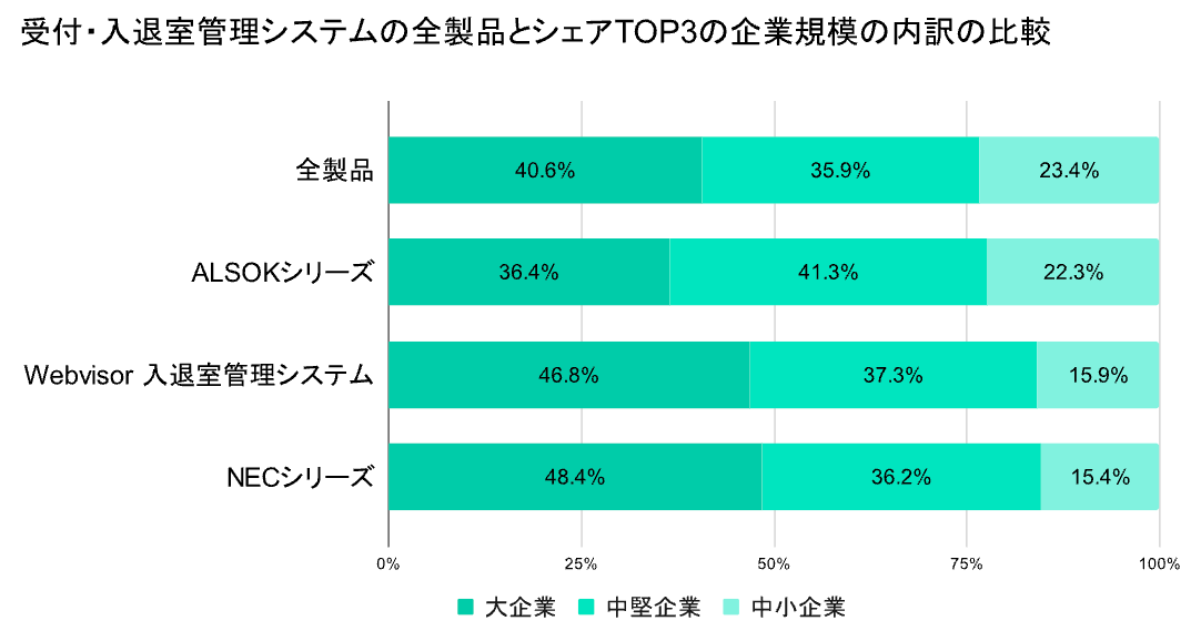 受付・入退室管理システムの全ての製品の企業規模ごとの市場調査は、1人から99人の中小企業、100人から999人の中堅企業、1000人以上の大企業を対象としました。計2,379件の有効回答を集計した結果、ALSOKシリーズが8.7%でした。次いでWebvisor 入退室管理システムが8.4%で、NECシリーズが7.9%でした。