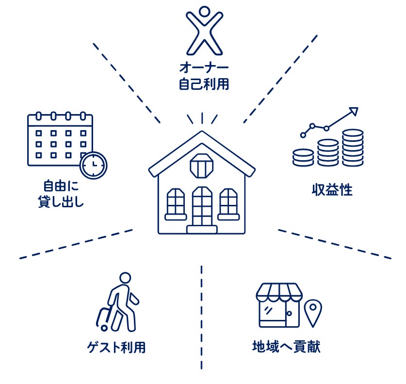 最大の特徴は、どなたでも、どんな期間でも、自由に貸し出しができるということです。別荘を所有するということだけでなく、ひとつの事業として成り立ち、柔軟な収益性と高収益を実現します。そして、オーナーが利用したい際には自由に使用することができ、生活に豊かさを加えます。
