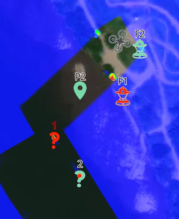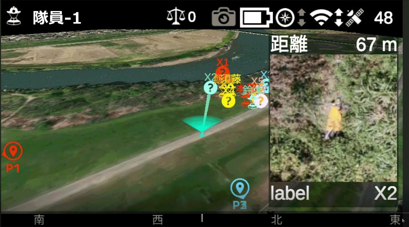 AIはドローンの映像をリアルタイムで解析し、含まれる人影を自動的に検出します。この検出された人影は即座に地図に反映され、タブレットやスマートグラスでその位置と画像を確認することができます。