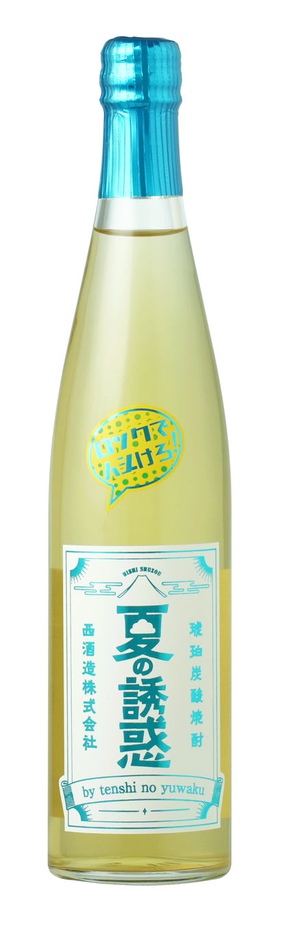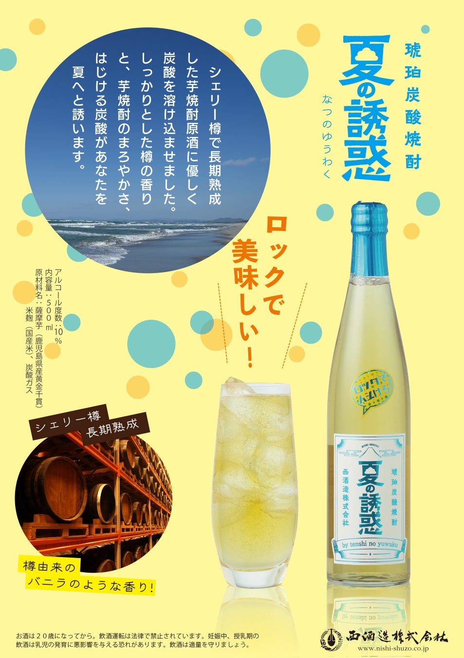 「琥珀炭酸焼酎 夏の誘惑」は、 樽長期貯蔵芋焼酎で、西酒造のロングセラー商品「天使の誘惑」のソーダ割りを存分に楽しんで頂くため、「天使の誘惑」の原酒をシェリー樽に3年寝かせた貯蔵原酒を使用し、炭酸をやさしく溶け込ませた樽の香りが爽やかな炭酸焼酎です。
