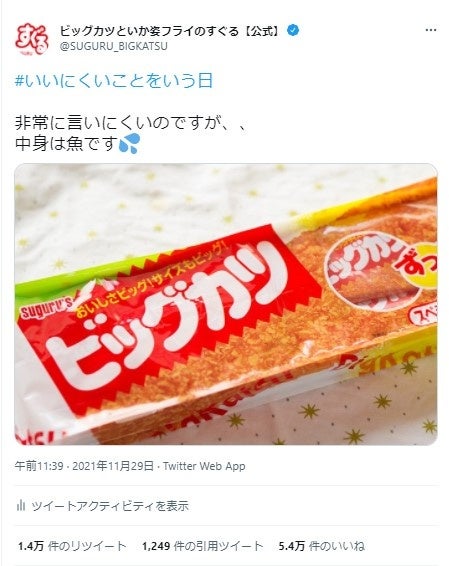 ビッグカツシリーズは魚肉シートが原料ですが、「カツ」という名前から、魚を使用していることに驚かれる方も多いです。弊社Twitterでは、2021年11月29日「いいにくいことをいう日」に魚肉シートが原料であることを投稿したところ、話題になり多くのメディアに取り上げていただきました。