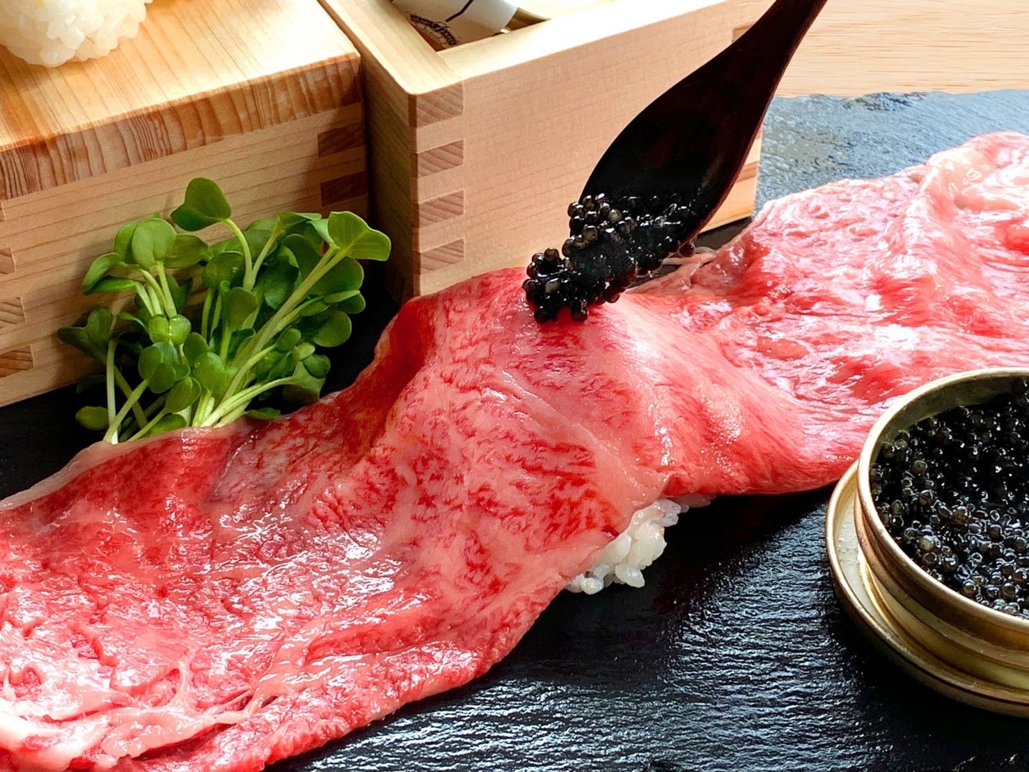 最高級リブロースはほんのり甘く口に入れた瞬間とろけ、濃厚なキャビアがお肉の旨味を引き立てます。自慢の肉寿司をお召し上がりください!