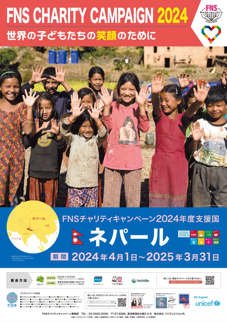 FNSチャリティキャンペーンは1974年の設立以来、フジテレビ系列全28局とビーエスフジが協力し、放送やイベント、SNS等で募金活動を行い、厳しい環境で暮らす世界の子どもたちのためにユニセフを通じて支援活動を行っています。2024年度は、2023年11月に発生したマグニチュード6.4の地震で150人以上が犠牲になり、20万人が被災したネパールの子どもたちの支援をおこなっています。