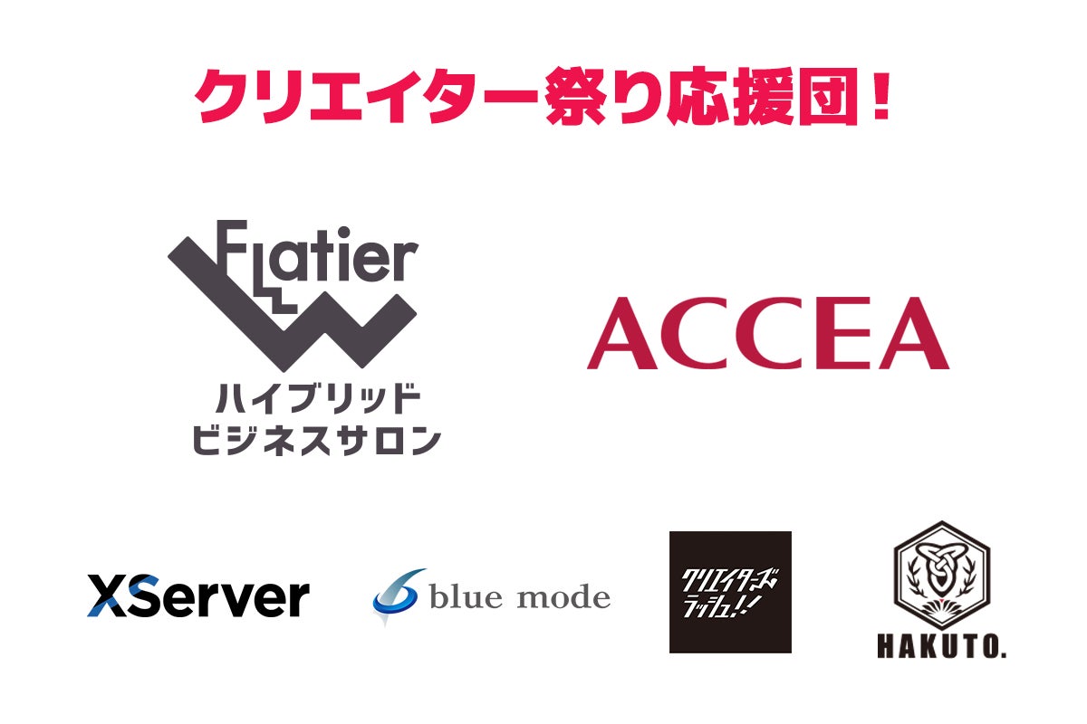 一緒にクリエイター祭りを盛り上げてくれる企業・団体の皆様によるトークセッションや抽選会などを開催。今年は企業セッションとしてコワーキングカフェを全国展開する総合印刷会社「ACCEA」様、会員900名を超えるハイブリッドビジネスサロン「Flatier」様にお話していただきます。