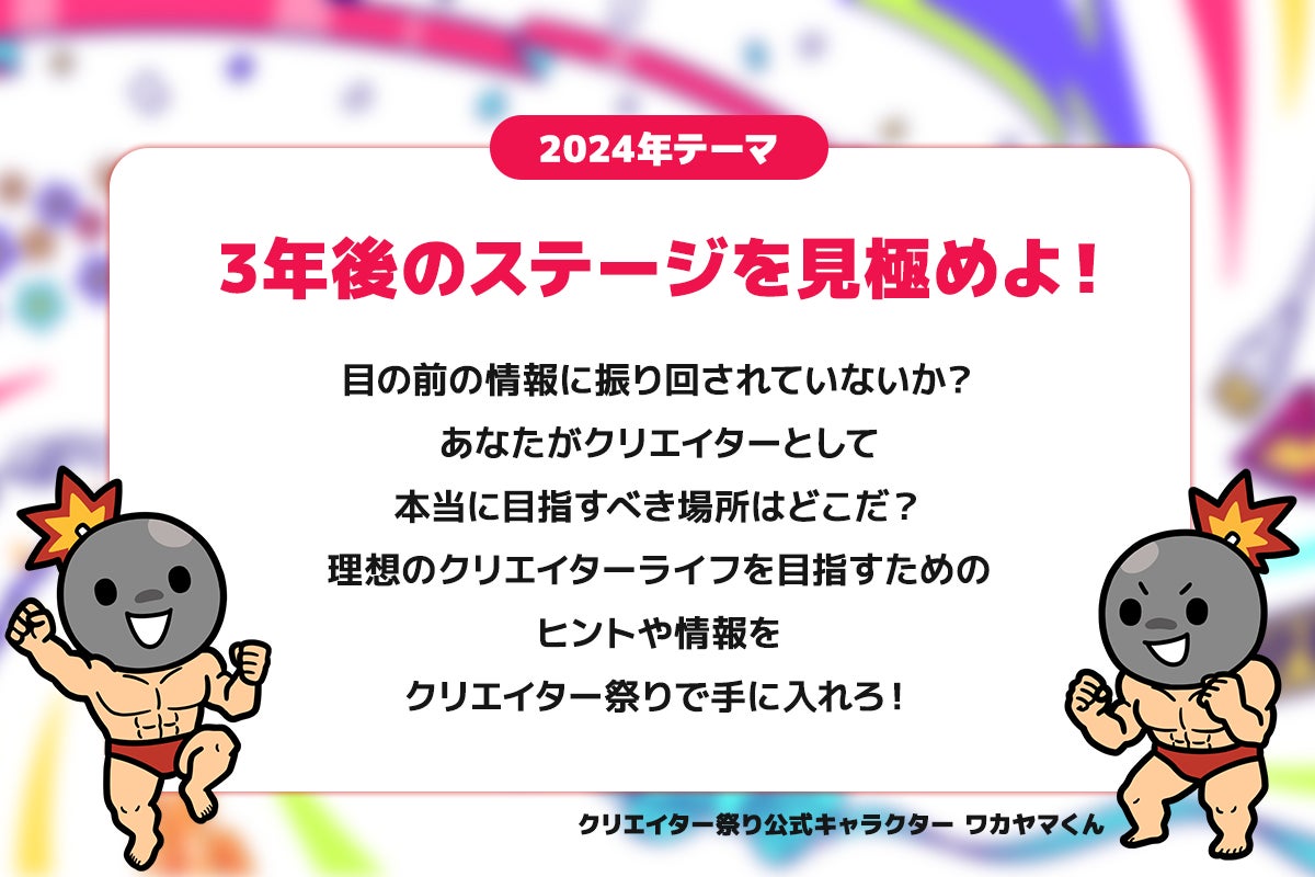 近年、SNSなどの情報に依存している傾向が強く、プロとしての活動としての実態と乖離していることが多数見受けられます。活動を始めてみたけどどうステップアップしていいか分からないなどの相談が寄せられることから、クリエイターとしてのキャリアアップ、ステージアップに迷走するクリエイターに次なる一歩のヒントを持ち帰って欲しいと、今年のテーマは「3年後のステージを見極めよ」に決定しました。