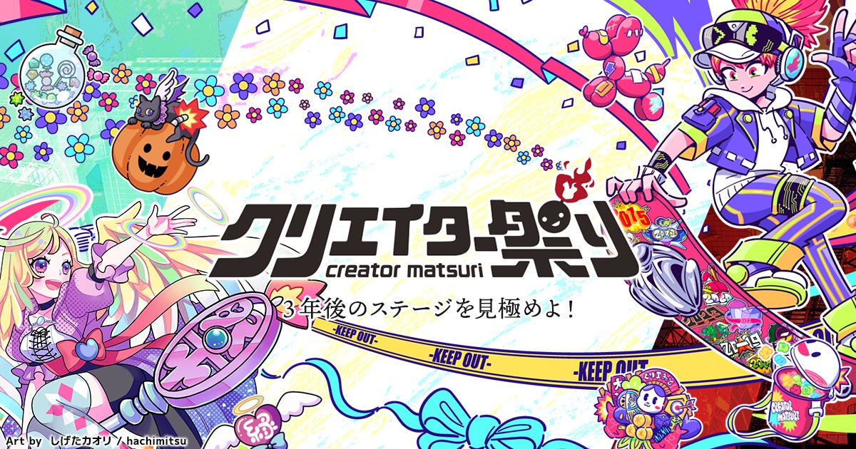 メインビジュアルは「見た人の思い出になるイラスト」を理念に活動するカラフルでポップなイラストレーター「hachimitsu」と、「大人になっても”かわいい”を好きでいていい!」を理念に活動するひと目で可愛いティーン・女性向けイラストを手掛ける「しげたカオリ」のコラボイラスト。両者ともに過去のクリエイター祭りのメインビジュアルを手掛けたアーティスト。