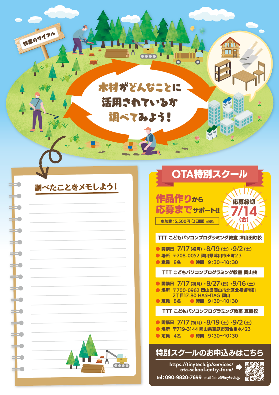 コンテストを運営するレプタイル株式会社が毎年おこなっている作品制作から応募までをサポートするOTA特別スクールや、岡山県北の小学校を中心に木育とプログラミングの出前授業もおこないます。