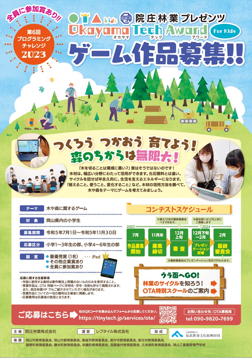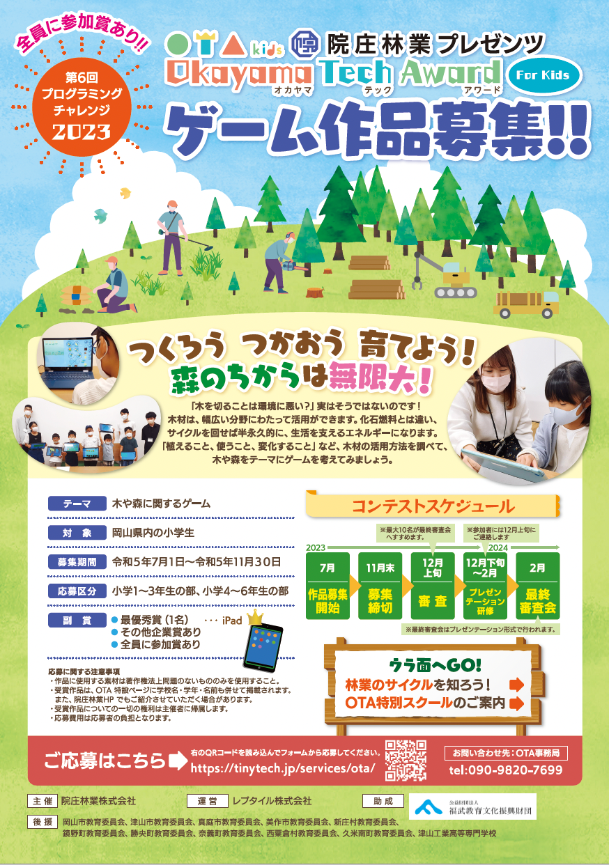 <第6回プログラミングチャレンジ2023「院庄林業プレゼンツ Okayama Tech Award For Kids」(以下OTA) 概要>