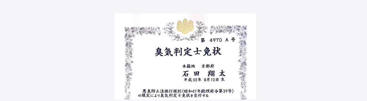 臭気判定士とは、環境省が管轄する、ニオイの公的技術者としては唯一の国家資格です。本来、臭気判定士は工場等の事業所から発生する悪臭評価を嗅覚測定法により行いますが、オドレートに在籍する臭気判定士は、本来の業務で用いる技術を体臭に応用して実践する、体臭に特化した臭気判定士です。