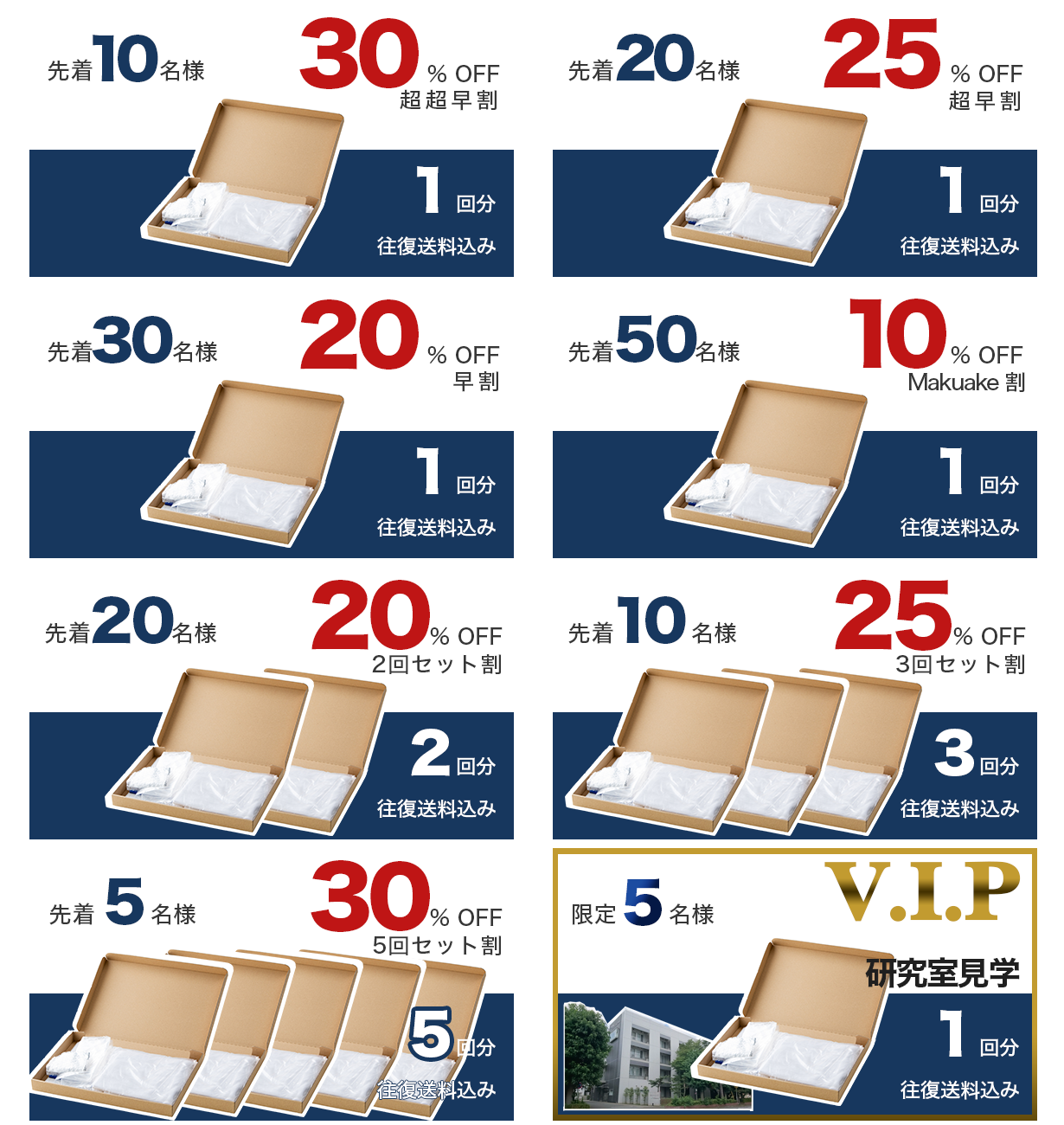 1回から複数回セットのリターンを応援購入サービス「Makuake」特別価格で8コースご用意しました。特におすすめなのが複数回セット。いくつかのデオドラント・制汗剤の効果を比較、デオドラント・制汗剤を使わない状態もチェック、ご家族とご一緒になど、様々なケースを確認しておくと安心です。