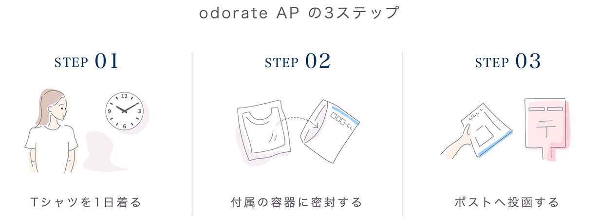 ワキガ検査と言っても、odorate APは病院に行ったり特別な道具を使ったりするわけではありません。ごく普通の無地のTシャツを1日着用するだけなので、検体採取中も普段通り過ごせます。その後、Tシャツをポストに投函すればあとは結果が届くのを待つだけ。