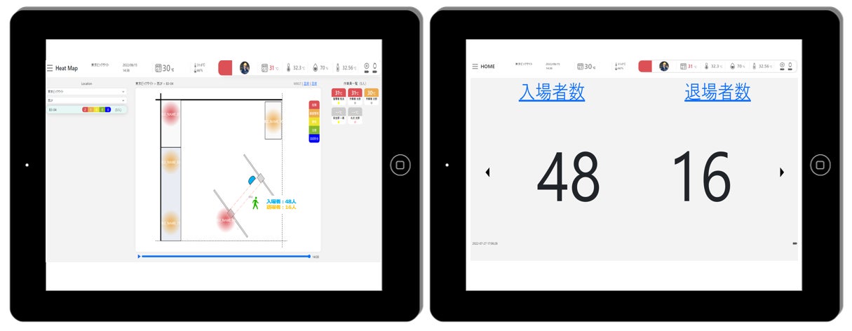 ThingBridge VISIONとTaliaとのアプリケーション連携により、利用ユーザーは人数カウント用アプリケーションを開発することなく、ThingBridge VISIONの1機能としてTaliaで収集されるデータを確認することが可能になります。複数のTaliaから発信されるカウントされた人数の情報はThingBridge VISIONによって一元的に管理することができ、例えば出入口が複数個所あるようなテナントにおいて、各出入口に設置されたTaliaから発信される情報をThingBridge VISIONが収集しそれぞれの出入口での時系列での入退出状態の把握やテナント内部に滞留している人数データを把握することが可能になります。またAIカメラを設置した環境にAgxが開発したIoT環境センサーを設置することで、現場環境の温湿度などの情報を同時に取得することが可能になります。