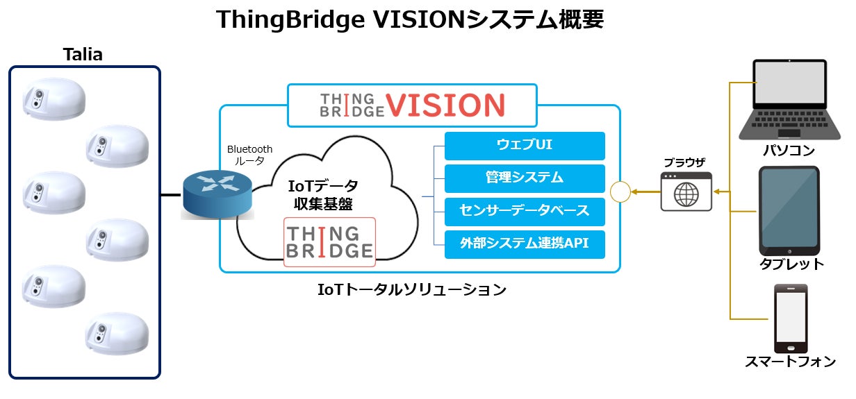 「ThingBridge VISION」は種々のIoTセンサーデバイスと、IoTデータ収集クラウド基盤、そしてデータ可視化用ウェブシステムなどIoTシステムに必要なすべてのコンポーネントをパッケージ化したソリューションです。お客様の様々なご要求に応えることが可能な拡張性を有するシステムです。
