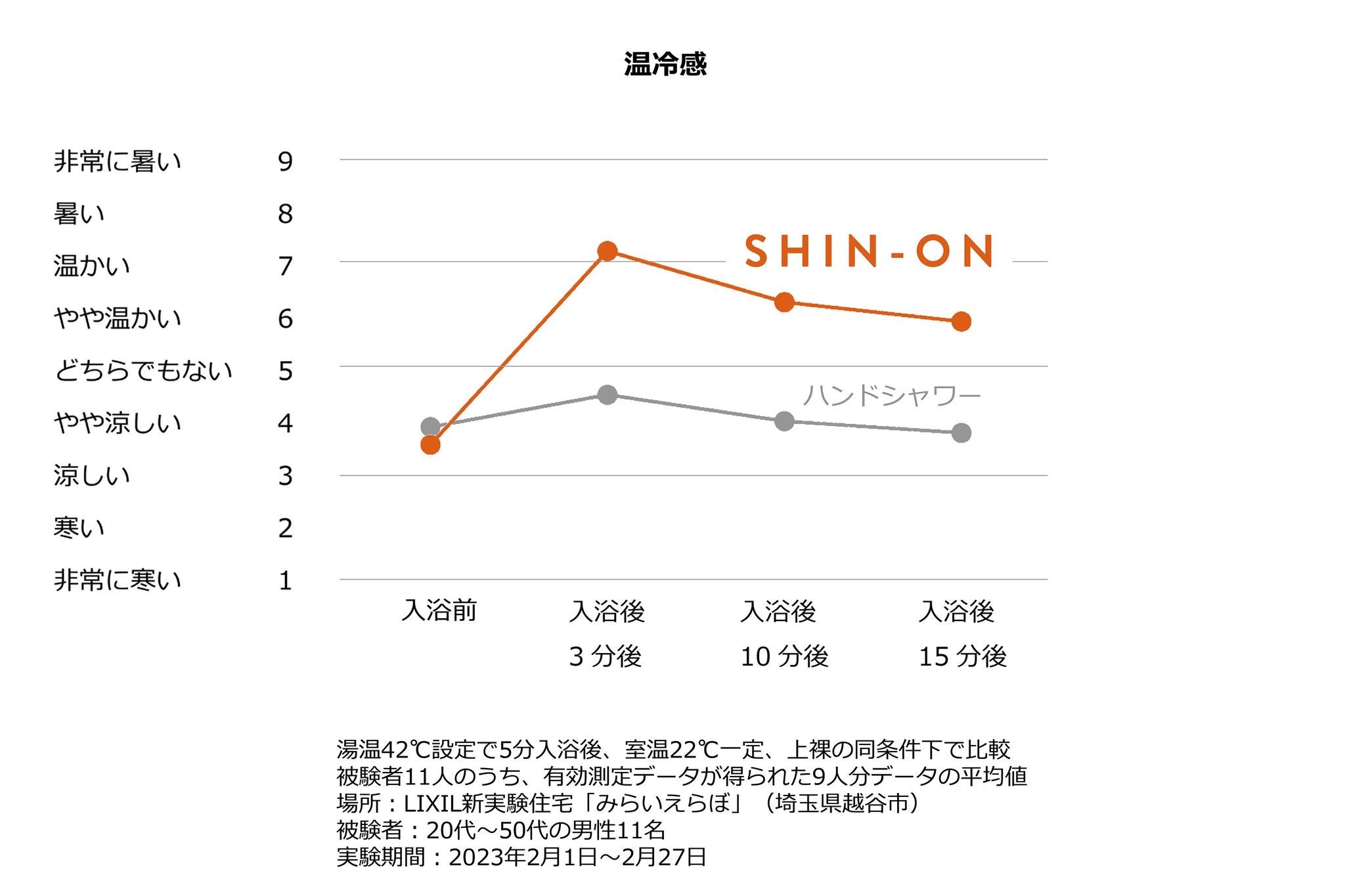 また、深部体温(舌下温度)の変化を測定したところ、ハンドシャワー使用時よりもSHIN-ON使用時の方が入浴後に深部体温が上昇し続け、入浴開始から15分後も深部体温が下がりにくく維持できており、時間が経過した後でも温もりが持続していることが確認できました。さらに、温冷感については、実際に利用したユーザーの主観データを取得するために、SHIN-ONとハンドシャワーで、入浴前/後の温冷感を数値化するアンケートを実施したところ、SHIN-ONの方が入浴直後から15分後まで、常時ハンドシャワーより温かく感じていることがわかりました。また、ハンドシャワーでは常に中間値「どちらでもない」よりも「寒い」という回答が多かったのに対し、SHIN-ONでは入浴後常に「温かい」という回答が多い結果となりました。