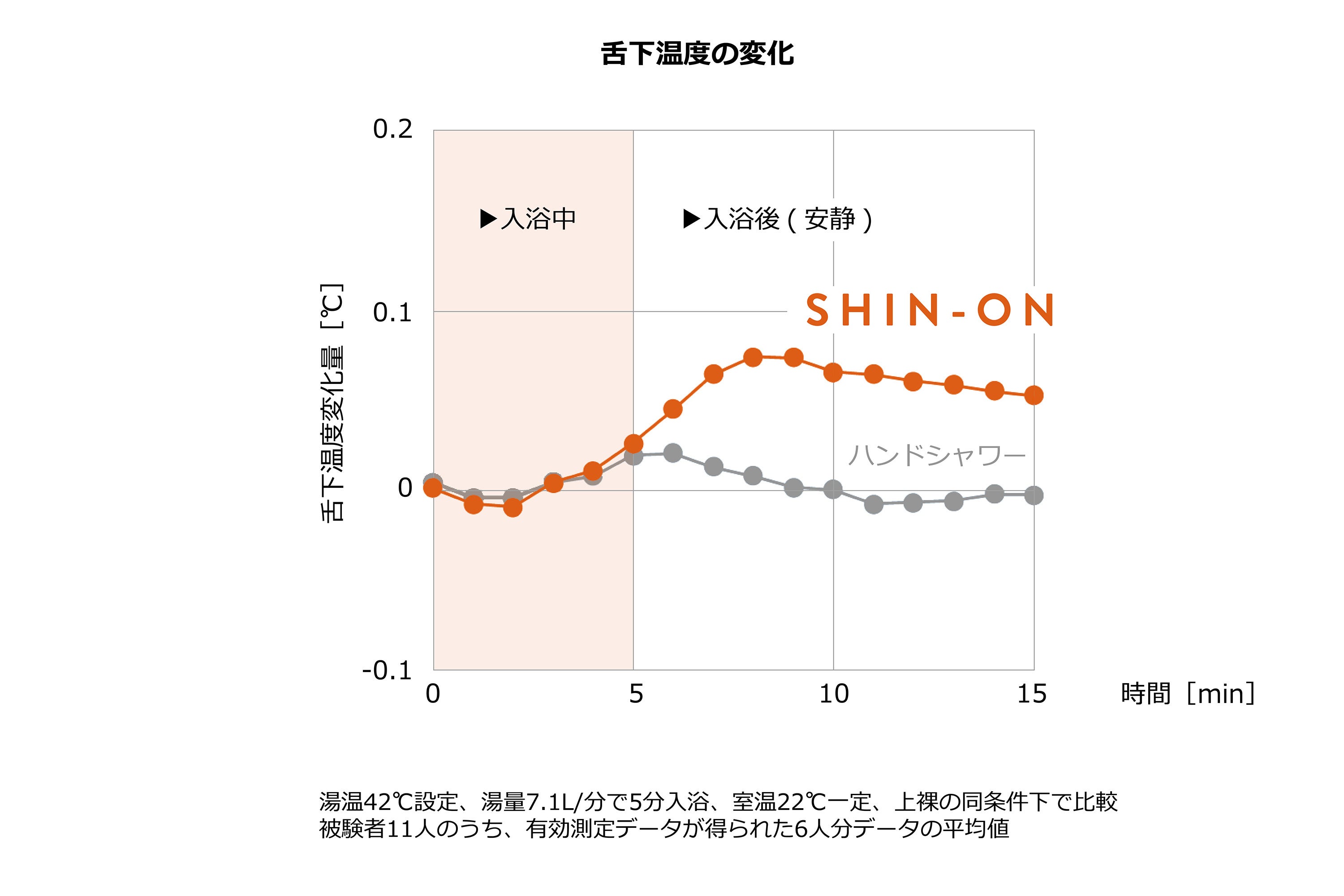 社員11名を対象に、SHIN-ON使用時とハンドシャワー使用時での体表面温度の変化を把握するため、それぞれ湯温42℃、流量7.1L/分で5分入浴する同条件下にて、入浴前から入浴後10分後までの体表面温度の変化をサーモ撮影したところ、SHIN-ON使用時の方が、すぐに上半身全体が温まり、かつ体表面温度が高く保たれて温もりが持続していることがわかりました。