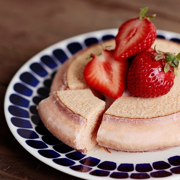 ピンクのバウムクーヘンは、あまおう苺パウダーがたっぷり生地に入っているから。