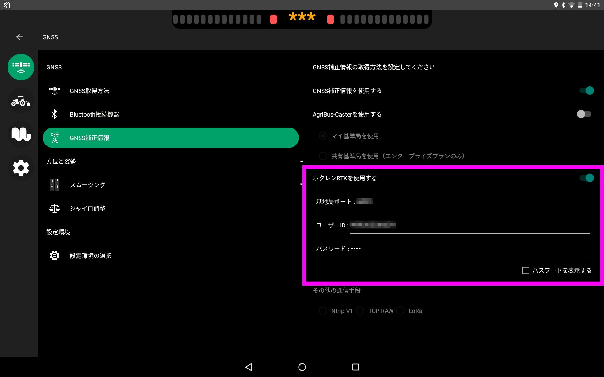 ホクレンRTKシステムを利用している方は、「AgriBus-NAVI」アプリの補正情報の受信設定において「ホクレンRTK」の項目を選択し、ご契約のユーザーID、パスワード、地域で受信できる配信元のポート番号を入力することで、「ホクレンRTKシステム」に接続できるようになります。