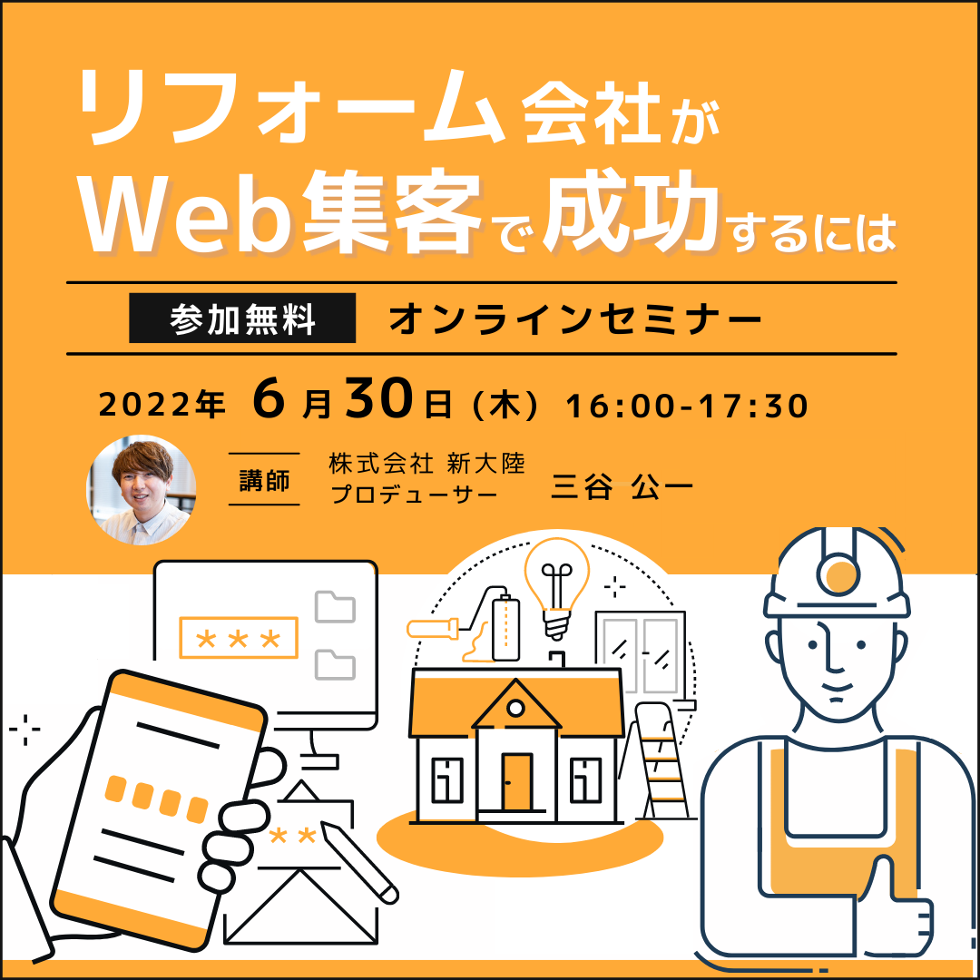 新大陸では来る2022年6月30日(木)に無料オンラインセミナー「リフォーム会社がWeb集客で成功するには」を開催予定です。